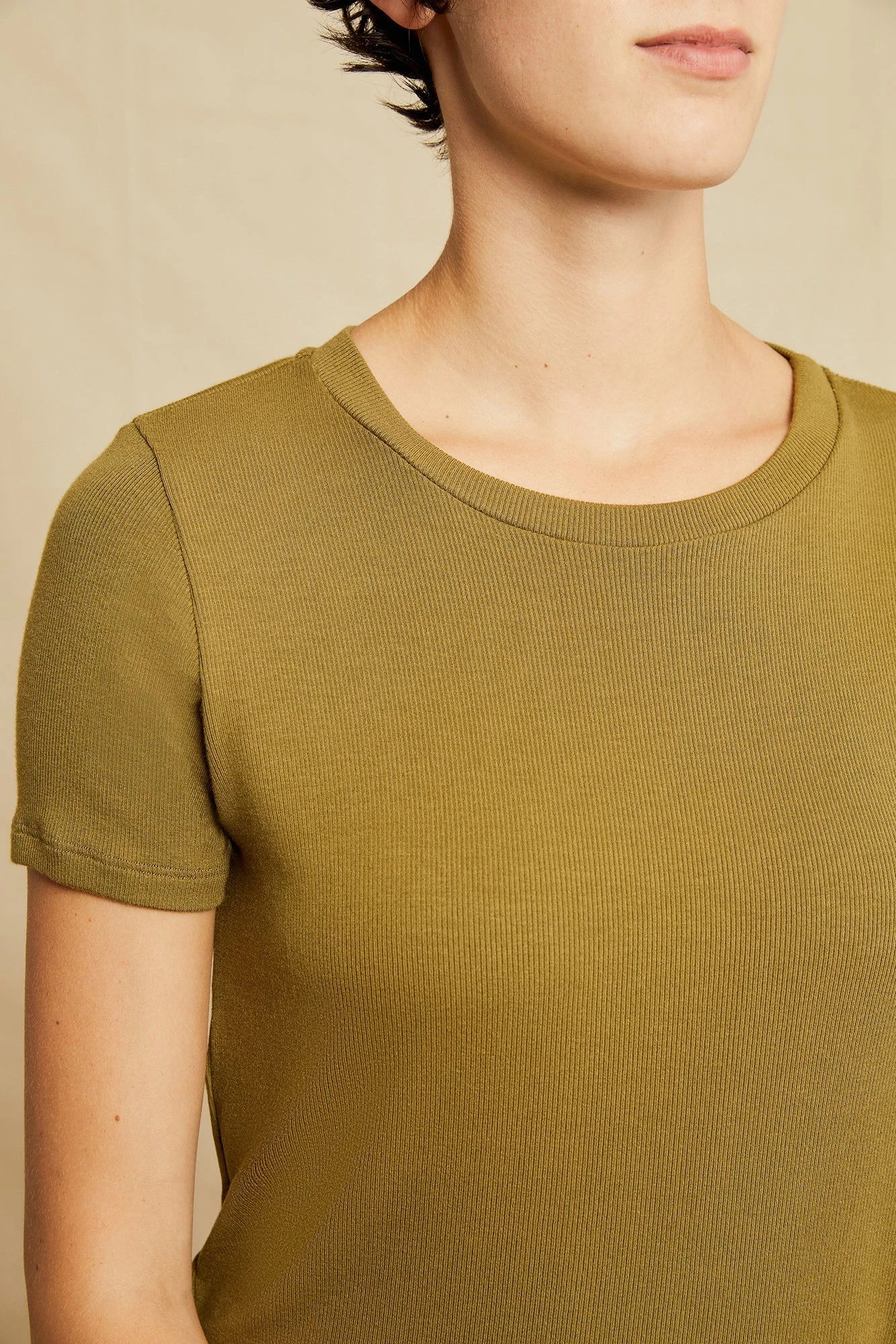 Short sleeve tee with an open neck and clingy, relaxed silhouette. Made in our silky-smooth Dream Rib, perfect for layering or wearing alone.
