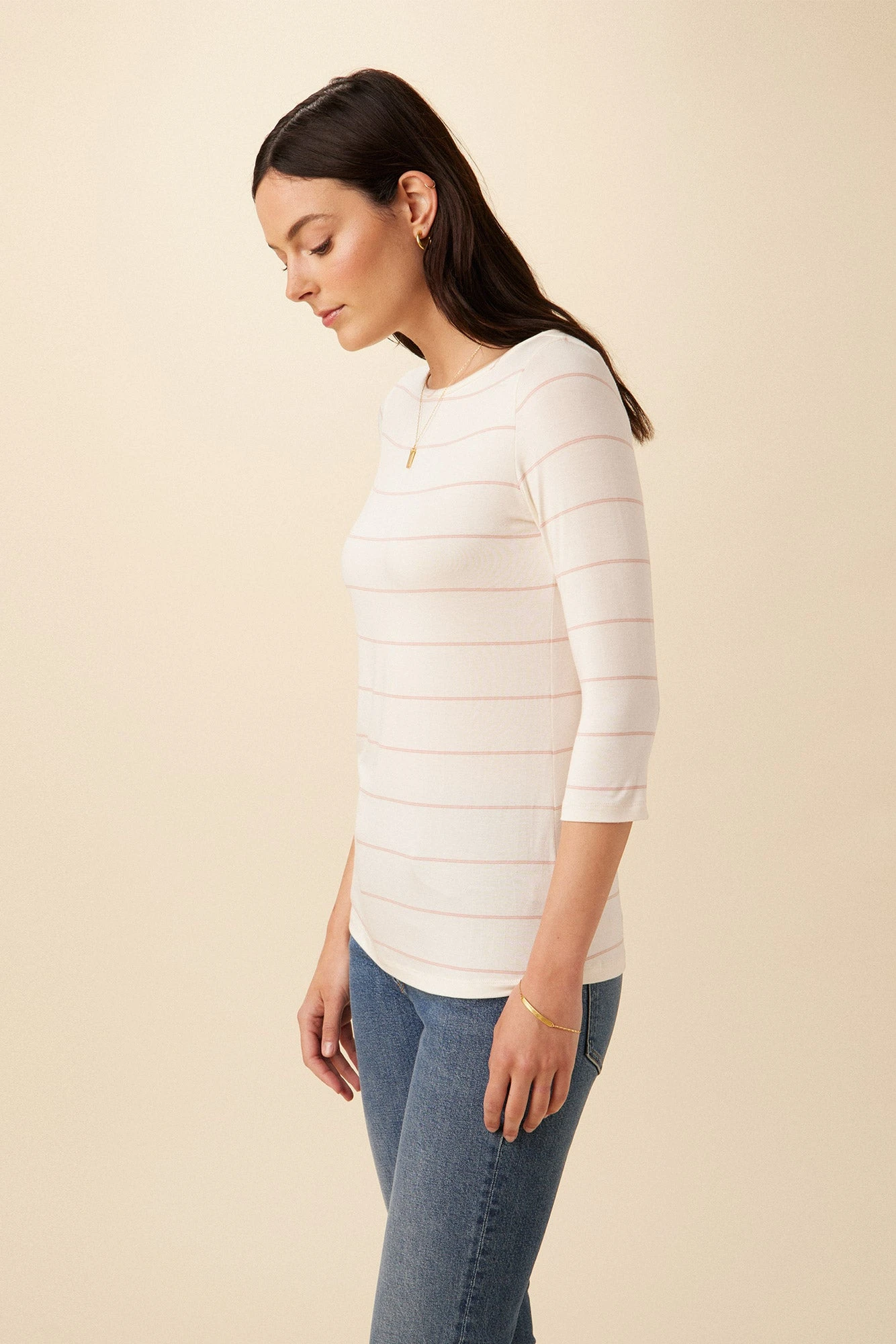 - 3/4 sleeve tee with a classic boat neckline and easy silhouette.