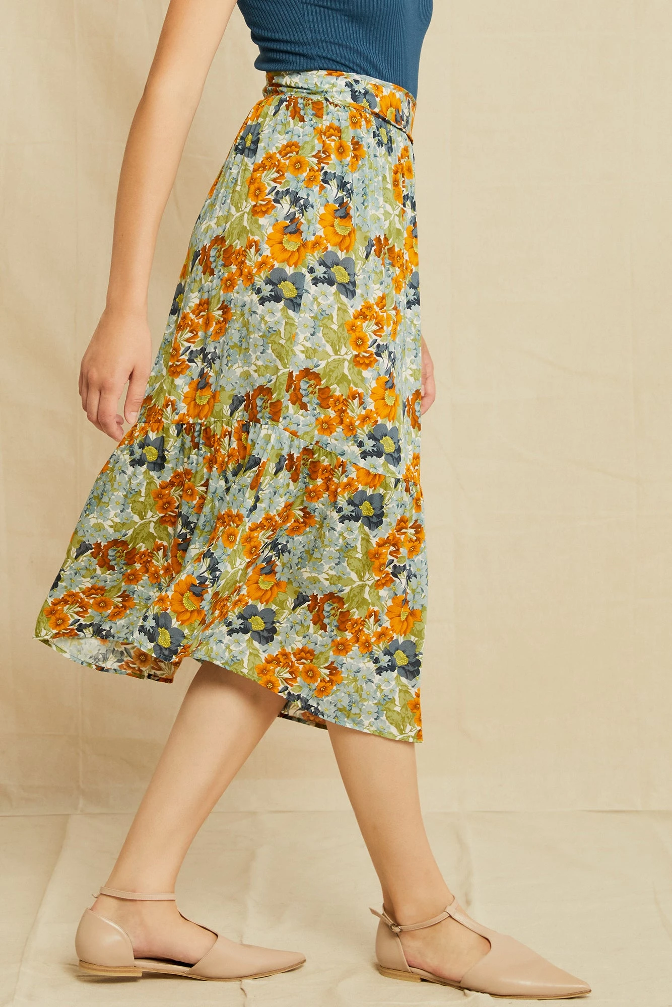 - High-waisted midi length A-line skirt